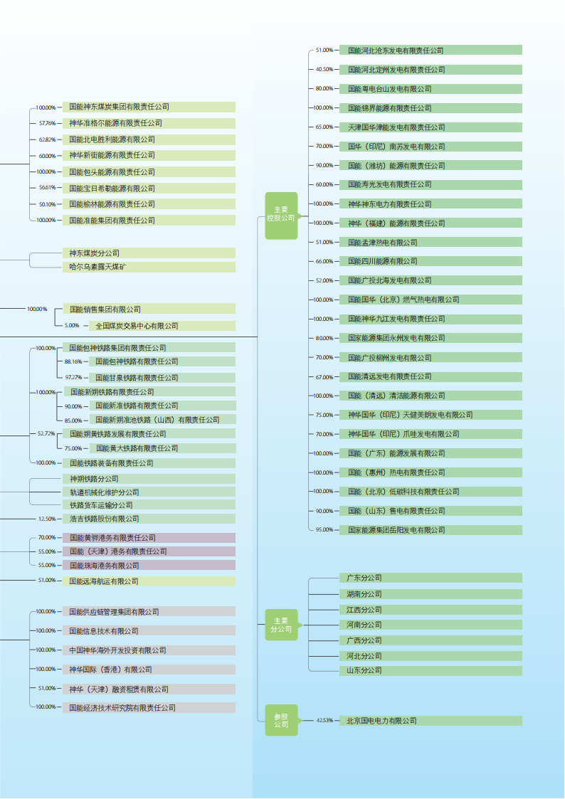 中國神華的主要運營模式為煤炭生產→煤炭運輸(鐵路、港口、航運)→煤炭轉化(發電及煤化工)的一體化產業鏈,各分部之間存在業務往來。