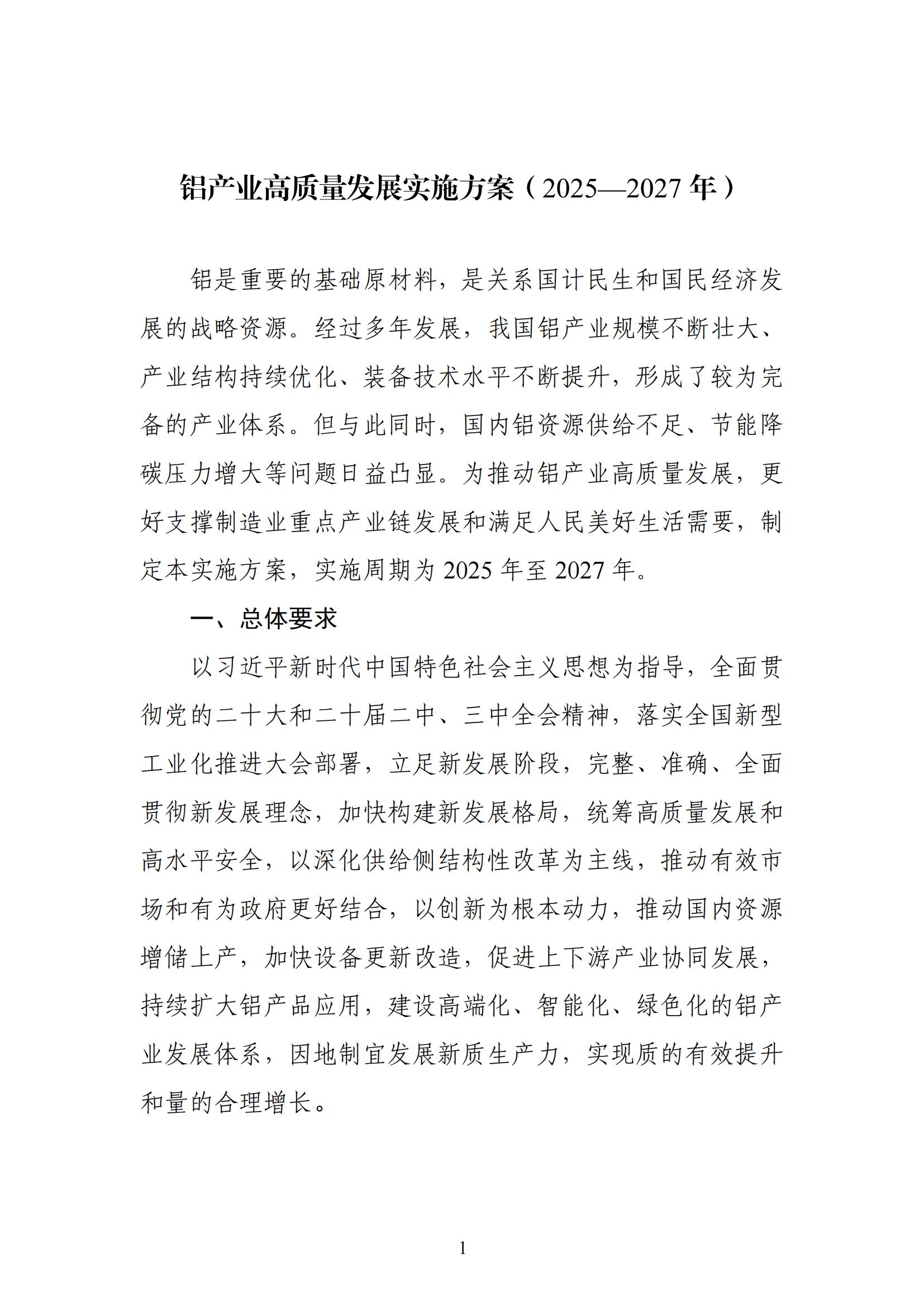 現將《鋁產業高質量發展實施方案(2025—2027年)》印發給你們,請結合實際認真抓好落實。