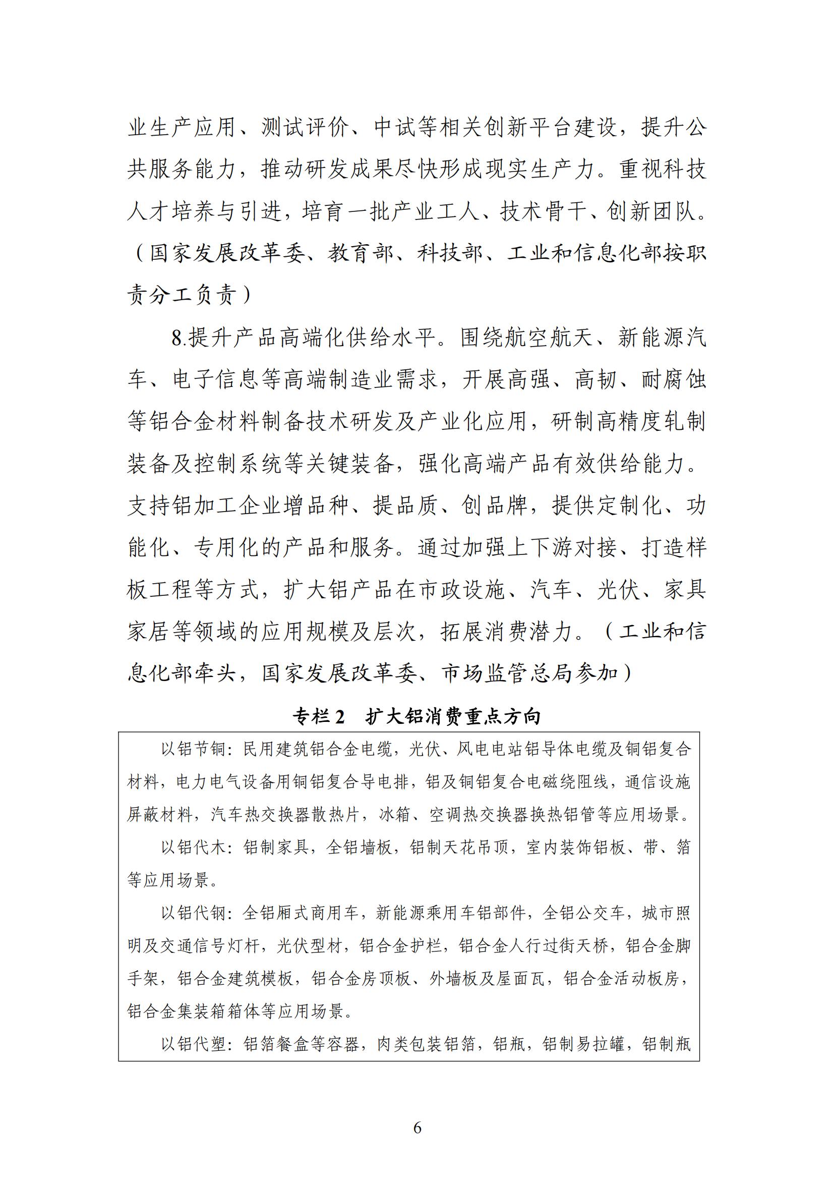 通知提到,提升產品高端化供給水平。通過加強上下游對接、打造樣 板工程等方式,擴大鋁產品在市政設施、汽車、光伏、家具 家居等領域的應用規模及層次,拓展消費潛力。
